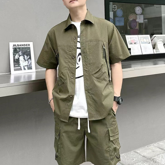 Summer new casual all-match solid color tooling two-piece suit men's loose youth couple shorts short-sleeved suit trendy
