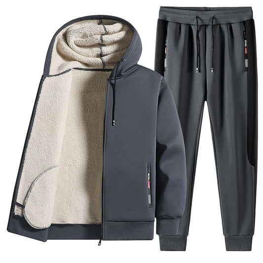 Winter plus velvet thickened lambskin jacket casual sports suit men's trendy clothes pants large size men's suits
